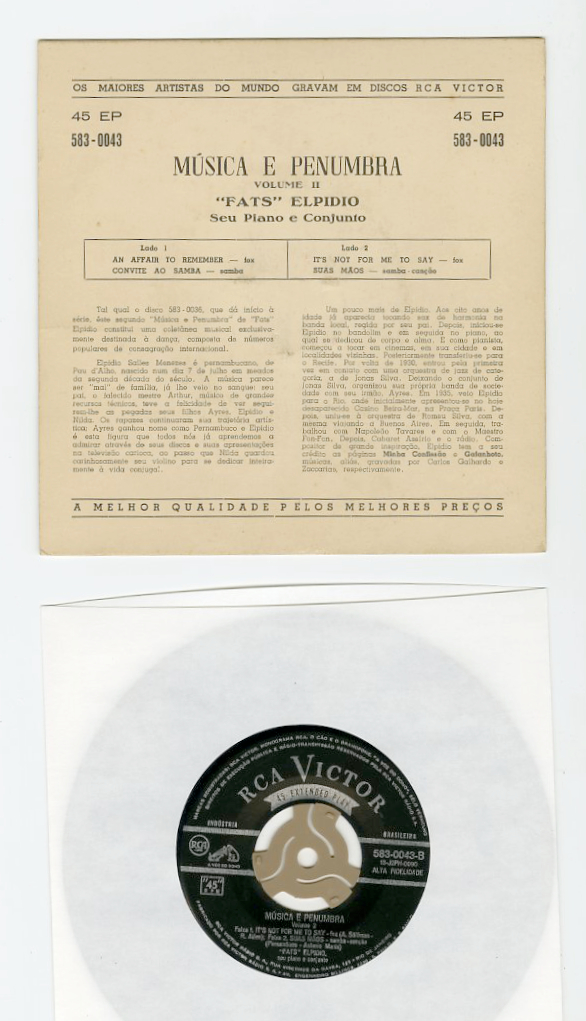 59年?。45 RPM。ピアニストFats Elpidioのラテンラウンジ〜サンバ・インスト。跳ねたピアノのタッチが印象的。A2おすすめ。